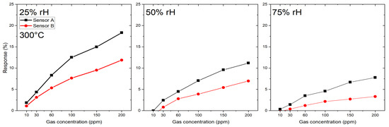 The response towards the target gas CO is shown in Figure 6. Six different gas concentrations were measured at an operation temperature of 300 C at three different humidity levels—25, 50 and 75%: 10 ppm, 30 ppm, 60 ppm, 100 ppm, 150 ppm and 200 ppm. Again, sensor A shows a higher response than sensor B, for example for a concentration of 200 ppm CO sensor A has a response of 18% (at 25% rH), while sensor B has a response of 12%.