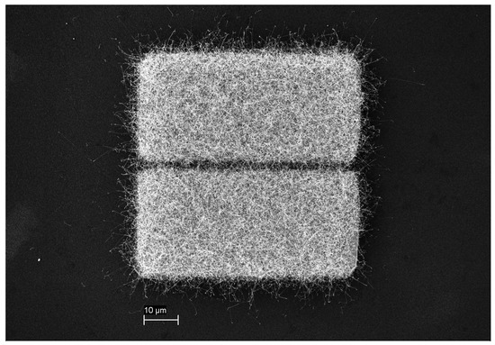 SEM picture of patterned growth of SnO NWs.