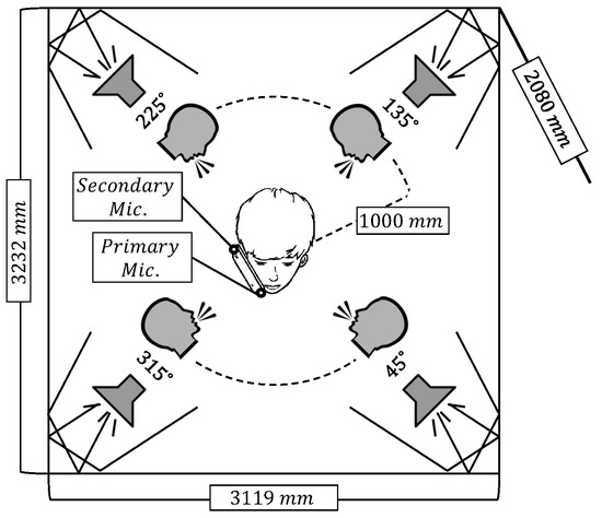 To demonstrate the performance of the proposed algorithm, we have recorded the desired speech, directional interferences, and diffuse noises with two microphones located on a commercial mobile phone, Samsung Galaxy S7. The placement of the user and the loudspeakers are illustrated in Figure 1. The size of the room was 3119 × 3232 × 2080 mm3 and the reverberation time of the room was approximately 120 ms. In the center of the room, one of the two male and two female speakers stood holding the mobile phone with the right hand in the handset mode. The desired near-end speech was spoken by those speakers in English. The distance between the microphones was about 140 mm. The diffuse noise field was generated by playing back white, babble, or car noises from NOISEX-92 database [35] with four loudspeakers facing the corners of the room to incur complex reflections as shown in Figure 1. Directional interferences were the speech utterances spoken by four male and four female speakers chosen from the TIMIT database, and were played from one of the four loudspeakers located 1000 mm away from the user at the directions {45°, 135°, 225°, 315°} facing the users as depicted in Figure 1. Two minutes of near-end speech spoken by one male and one female speakers was used for the training of the SVM and the parameter setting of other approaches, while another six minute long speech spoken by the other male and female speakers was used to generate the test data. The near-end speech was mixed with a directional interference coming from one of the four loudspeakers or one of the diffuse noises at the SNR level out of {−5, 0, …, 20} dB on the primary microphone, which makes the total length of the training and test data 84 and 252 min, respectively. The sampling rate was 8 kHz, and 256 point Hamming window was applied with 10 ms frame shift. The frequency index range (, ) considered in and LTIPD was (4, 31), which corresponds to (125 Hz, 968.75 Hz), considering that the microphone distance was 140 mm. The range of the target DoA for the ITD-based VAD statistics was set to be (10°, 70°) when 0° corresponds to the end-fire direction to the primary microphone side. The range of the target DoA for the reliable frequency selection that determines and in Equation (9) was (0°, 80°), which was a bit wider than that for VAD. These values were set to allow the deviation of the estimated DoA due to the noises and the individual variability in how to hold the phone. The thresholds for and , and , were set to minimize the equal error rate on training set. The parameters for the LTIPD-based VAD, L and U, were set to 12 and 10, respectively. was set to 3.
