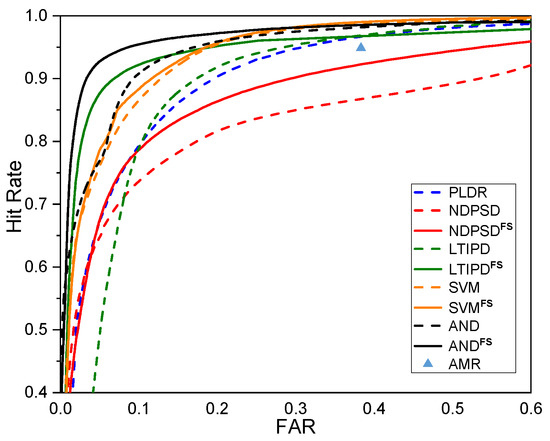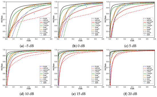 The performances of the various ILD- and ITD-based VAD methods with and without the proposed reliable frequency bin selection for the whole test data are shown in Figure 2 in the form of the receiver operating characteristics (ROC) curves. The original ROC curves are the collection of the (Hit rate, FAR) pairs with different threshold parameters, so one ROC curve can be drawn for each number of hangover frames for each VAD. The curves shown in Figure 2 are the collection of the leftmost points among all ROC curves with different hangover parameters given the hit rate for each VAD method. Adaptive multi-rate (AMR) VAD option 2 was also shown as a performance benchmark [7]. The performances of the original VAD methods using all frequency bins are shown as dashed lines, while the solid lines indicate the performances of the frequency selective versions of the corresponding methods. The VADs with the proposed frequency selective approach outperformed the original VAD methods. Among all the methods, , the frequency selective version of , performed the best when the false alarm rate (FAR) was less than 29.02%, while was the best when we need a hit rate higher than 98.06% in the expense of a higher FAR. Figure 3 shows the ROC curves for different SNRs averaged over all noise types. The tendency that the reliable frequency selection improves the performance was similar in all cases except some regions with very low hit rates. The performance difference between and was not as large as in [30], possibly due to the mismatch in the near-end speakers in the training and the test. could further enhance the performance of the with dynamic frequency selection, especially for the lower SNRs. Table 1 shows the performance of each VAD in terms of accuracy, precision, and recall at the operating point minimizing the overall error rate defined as [30], in which FRR denotes the false rejection rate. α was set to 0.8 as the false rejection may be more critical for variable rate speech codecs or speech enhancement. Experimental results in a more reverberant environment are also available at the demo page (https://mspl.gist.ac.kr/vad_demo/dualchannelVAD.html).