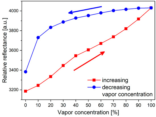 Peak intensity of the relative reflectance spectrum of a Polyommatus icarus specimen during increasing/decreasing ethanol vapor concentration. The graph showing hysteresis suggests that capillary condensation of the vapors is the governing process during the color change of the butterfly wings.