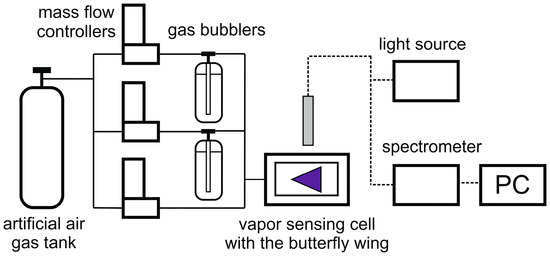 The investigated species were not subjected to any restriction. The samples used in this study belonged to the curated collection of the Hungarian Natural History Museum. The males of Heliophorus yunnani (Lycaenidae: Heliophorini) [35], Morpho aega (Nymphalidae: Morphini) [23,36], Polyommatus icarus (Lycaendiae: Polyommatini) [30,37], Chrysiridia rhipheus (Uraniindae) [23,38], and Hypochrysops polycletus (Lycaenidae: Luciini) [39] species all possess photonic nanoarchitectures in their dorsal wing scales which generate intense structural colors. These open nanostructures allow for the fast exchange of test substances during vapor exposure, which results in high vapor-induced optical responses of the wings. The separated wings were inserted into an air-proof aluminum cell with a gas inlet and outlet (Figure 2). During the vapor sensing experiment, a constant gas flow of 1000 mL/min was used [28]. The saturated vapors for the mixtures were obtained from two gas bubblers and the vapor concentration was set by computer-controlled digital mass flow controllers (Aalborg DFC, Aalborg Instruments & Controls Inc., Orangeburg, NY, USA), which mixed the saturated vapors and the synthetic air to the desired ratio. At every vapor concentration step, a 20 s vapor flow was followed by a 60 s purge of synthetic air to recover the initial reflectance of the wings before the introduction of the next mixture. The optical responses of the wings were measured through the quartz window of the vapor sensing cell, which provided transmittance in the whole ultraviolet-visible (UV-VIS) wavelength range. The samples were illuminated by an Avantes DH-S-BAL (Avantes BV, Apeldoorn, Netherlands) deuterium-halogen light source under normal incidence, while the reflected light was collected under ~45°, where the highest intensity of the wing reflectance was detected. The reflectances of the wings were measured with an Avantes HS 1024×22TEC spectrophotometer (Avantes BV, Apeldoorn, Netherlands). The optical response of the wings during vapor exposure can be characterized by the color change of the photonic nanoarchitecture. To express this color change signal, the relative reflectance spectra (∆R) were introduced [22], where the initial spectrum of the wings in artificial air (R0) was used as a reference during the measurements: ∆R = (R/R0) × 100%.