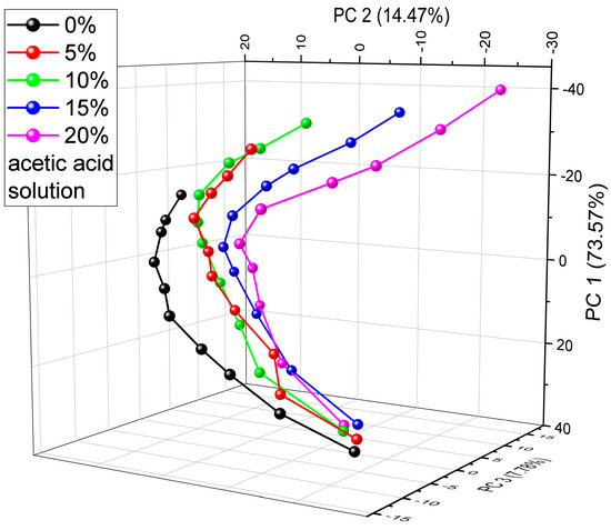 The optical response of the wings of a male P. icarus specimen was investigated when the vapor mixtures of two different materials (water, acetic acid) were introduced into the sensing cell. We investigated how the structural color changed during the exposure of mixtures of different concentrations and how it is related to the previous results for the pristine vapors. In our previous research, we found that in the PCA results of the vapor sensing measurement with seven test substances, the trajectories of water and the 10% acetic acid solution were close to each other, showing their similar optical effects when they were applied [28]. Here, we prepared four different acetic acid and water solutions, where the acetic acid content ranged from 5% to 20%, and applied them as test substances in the vapor sensing experiment. The optical responses were measured for every solution at 10 concentration values from 0% (pure artificial air) to 100% (saturated vapor of the solution). The reflectance spectra measured during the vapor exposure were analyzed using PCA. The PC scores plot of pure water (0%) and the four solutions (5–20%) in Figure 3 shows that the vapor-specific trajectories shifted with increasing acetic acid concentration, but they preserved the characteristic shape throughout the whole concentration range. The vapor concentration along the trajectories increases from the bottom to the top of the plot. The cumulative variance of the PCs was 96%; PC 1 = 73.57%, PC 2 = 14.47%, PC 3 = 7.78%.
