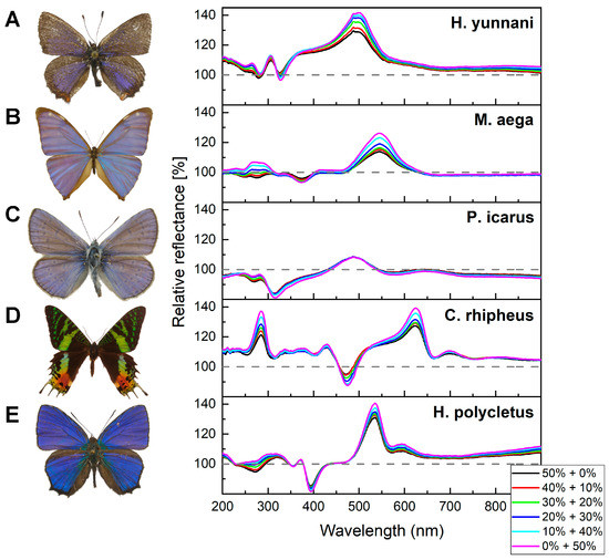 The vapors prepared from pre-mixed solutions provided promising results, but, in most cases when the components’ volatilities are significantly different, a separate preparation of the vapors is needed. To achieve this, two independent gas bubblers with the required substances were used, and the saturated vapors were mixed together in the desired ratio using mass flow controllers. This mixture was also diluted with artificial air to control the concentration of the vapor mixture. With this setup, we investigated the optical responses of five structurally colored Lepidoptera species. Figure 4 depicts the characteristic responses for acetone + ethanol mixtures. The changes in the structural colors caused by the different acetone + ethanol vapor mixtures always fell between the optical responses generated by the two pure substances in a consecutive order, i.e., the phenomenon that was demonstrated in detail with acetic acid + water solutions occurred in all investigated species and also with other substances. The optical response from a certain vapor mixture consists of the linear combination of the optical responses caused by the vapor components separately. As long as characteristic differences exist between the two components’ optical responses (e.g., wavelength shifts in the relative reflectance spectra), the optical response of the vapor mixture will also be substance-specific. This suggests that the photonic nanoarchitectures occurring in the wing scales are capable of chemically selective sensing of pure vapors as well as vapor mixtures. The different sensitivities of the different photonic nanoarchitectures were also observed. The relative reflectances of M. aega, C. rhipheus, and H. polycletus specimens during the vapor exposition showed a high degree of separation in the high ethanol concentration range (20% acetone + 30% ethanol, 10% acetone + 40% ethanol, and 0% acetone + 50% ethanol), whereas in the case of H. yunnani, we observed equidistant increases throughout the entire concentration range. In this measurement, the wing of P. icarus only showed moderate sensitivity and a significant color change was only observed in the near-UV wavelength range.