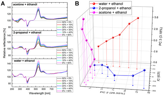 To investigate the chemically selective behavior of the butterfly-wing-based sensor in detail, a H. polycletus male specimen was used in the vapor sensing experiment and three different vapor mixtures were applied. The measured optical responses, i.e., the reflectance change spectra of the wing in the case of acetone + ethanol, 2-propanol + ethanol, and water + ethanol vapor mixtures were recorded, and the results are depicted in Figure 5A. The concentration of the first saturated vapor component was set from 0% to 50%, whereas the second component was set adversely (50% to 0%). The mixture was diluted with artificial air in a 1:1 ratio. All vapor mixtures showed similar behavior, as described earlier, as the optical responses of the mixtures fell between the pure solvents. To analyze the vapor-specific behavior, the measured data were evaluated with PCA. Figure 5B provides the PC scores plot, which contains the vapor sensing trajectories of the three different vapor mixtures. The cumulative variance of the PCs was 98%; PC 1 = 68.35%, PC 2 = 26.55%, PC 3 = 3.18%. The three data points on the left that are close to each other, from which the trajectories originate, are the points of the pure ethanol vapor spectrum. Away from this, the curves spread apart, as the compositions of the mixtures shift to their other components (water, 2-propanol, and acetone).