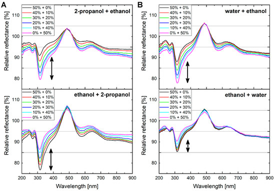 Finally, in the case of aqueous solutions, a so-called memory effect may occur. In Figure 6, the results of two independent measurements are depicted, where the order of the components was reversed in the second case. When two volatile compounds were applied, no differences were observed, but when water was used instead of the first component, a slight alteration in the measured optical response occurred. This is not an irreversible color change of the wing, but longer purging times with artificial air are required when water vapors in higher concentrations are used. This is attributed to the less volatile nature of water compared to other substances, whereas its interaction with the chitin photonic nanoarchitecture is relatively strong, which also results in high optical responses.