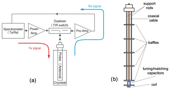 NMR spectroscopy system: (a) Basic schematic diagram and (b) schematic of the probe used in condensed matter physics (co-axial cable (orange) connected to the coil at the bottom by two variable capacitors (blue)). Thin stainless steel tubes parallel to the cable keep the structure stable, while transverse plates block external radiation from reaching the coil space.