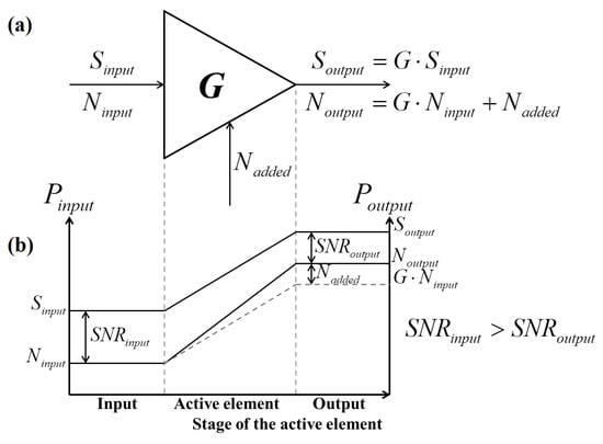 where and stand for the ratio of signal power and the root mean square (RMS) value of the noise power at the input and the output of the chain’s element for which we want to define the noise properties, respectively.