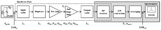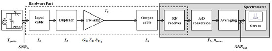 A block diagram of the analysed chain is shown in Figure 3, where , , and stand for the linear values of power loss for the input cable, duplexer, and output cable, respectively. Furthermore, and stand for the linear value of power gain and noise figure of the pre-amplifier, respectively. stands for the linear value of the spectrometer’s overall noise figure (its RF receiver, A/D converter, and digital signal processor (DSP) altogether). Inserting the above definitions for various chain parameters into (4), one gets the expression for of the NMR receiving chain: