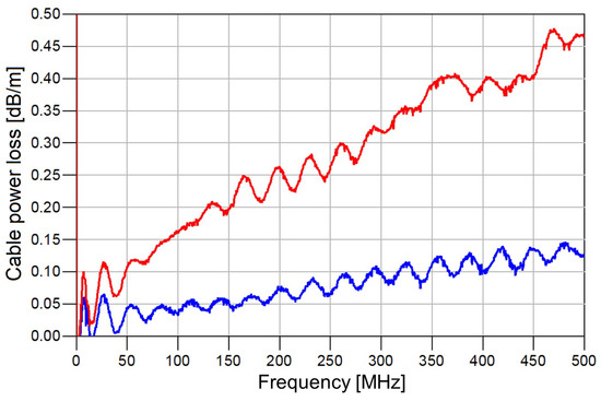 Losses of coaxial cables per unit length in the case of standard coaxial cable (red) and high-quality coaxial cable produced by Fujikura company (blue).