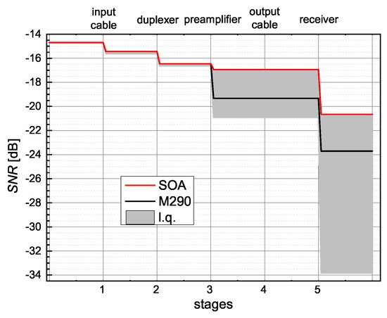 Calculated deterioration of the weakest signal that has dB along NMR receiving chain, for various conditions: existing chain with SOA (red) or M290 (black). The gray area depicts an estimated range of NMR signal’s deterioration by placing low-quality (l.q.) elements in the chain.