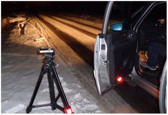 These recordings were made on a road in the outskirts of a small town in Poland []. There was snow on the road, but not on the area below the tires, see Figure 3. The car used in the recordings was a Renault Espace IV (2007). The recorded data included 84 drives, representing 28 drives with acceleration from 50 to 70 km/h, 28 drives with stable speed, 50 km/h, and 28 drives with deceleration from 70 to 50 km/h. The car was equipped with manual transmission, and all drives were recorded without changing gear and without applying brakes (engine braking only). The data were recorded around 6–8.30 p.m.