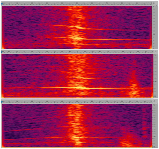 Figure 5. Spectrograms for deceleration (upper graph), stable speed (middle graph), and acceleration (lower graph). Horizontal axis represents time, vertical axis represents frequency. Higher luminance (brighter color) corresponds to higher amplitude. Graphs obtained from Adobe Audition [].