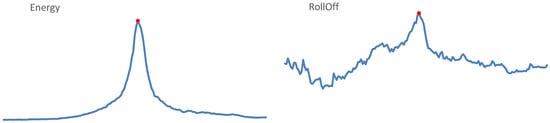 Evolution of exemplary features (Energy and RollOff) in time through the entire 10 s segment. The central point is marked in red.