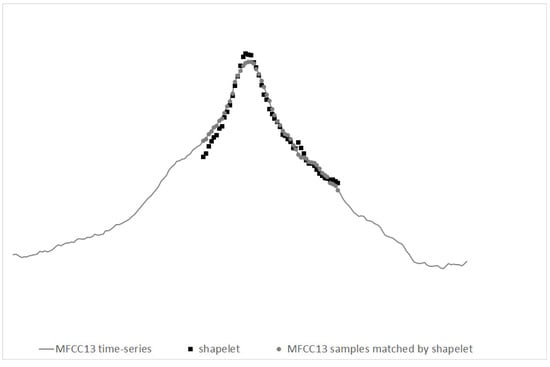 Shapelets were extracted for the data corresponding to the evolution of the 85 basic feature values in time, for each feature separately. A shapelet is a shape representative for a given decision class. Shapelets are extracted from the training data as segments of the data of the length shorter than the full series. We based this representation on fast shapelet algorithm, which requires fixing the length of shapelets []. In our case, we looked for the best matching shapelet of length 10, …, 170, with the step of 10 points.