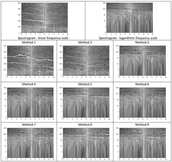 In Figure 8 we illustrate the difficulties encountered when calculating lines using the methods described in Section 3.2.4. As we can see in the original spectrogram, lines for the sound representing the car approaching the microphone are more clearly visible (for this example). In Method 1 the lines visible in the spectrogram are often lost, but in Method 2, where we use a high-resolution spectrogram, the paths better fit the lines. Methods 3–9 use spectrograms in a logarithmic frequency scale. The advantage of this solution is that in the logarithmic frequency scale the lines we search should be parallel. Therefore, we can easily detect a false line, which does not correspond to any target line in the spectrogram, as its slope will differ from the other two. It can be used to verify the found lines. However, the drawback of the logarithmic frequency scale is that the spectrogram is very blurred for very low frequencies, and our target lines are very close to each other. Additionally, they are weakly sloping, while the slope is the indicator of the type of speed change. Method 4 simplifies the procedure of searching candidates for the lines, and as we can see the found paths and lines are almost accurate in the exemplary sound. In Method 5 we use weighted linear regression and we get worse approximation results. The rest of our methods (6–9) give good results, comparable with Method 4, in the presented example.