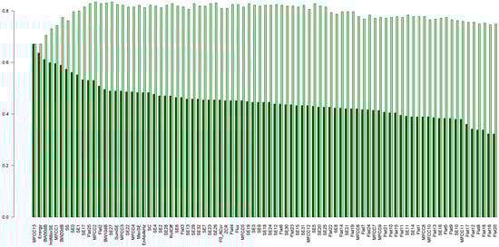 Accuracy obtained using shapelets. Features sorted according to the decreasing accuracy of shapelet trees. Dark-green bars represent accuracy for single trees, light-green bars represent the accuracy of the forest, created by adding trees one by one. Graph obtained for the left channel data.