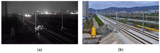 Comparison of images at non-operational and operational period: (a) railway intrusion sample at night; (b) images in operational period.
