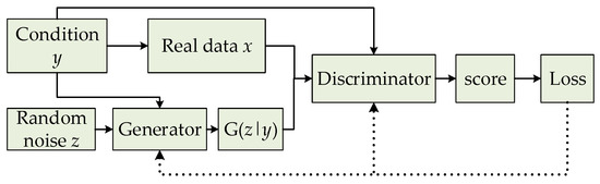 However, this unsupervised learning without pre-modeling is too free. GAN has problems such as difficult training, model collapse, and a poor learning effect. In order to solve these problems, conditional GAN (CGAN) [15] is proposed so as to add a conditional variable (y) to both the generator and discriminator, as shown in Figure 3. Currently, the input noise (z) and conditional variable (y) form a joint hidden layer of representation information, and can be input into the generator for guiding data generating. Then, the optimization problem is transformed into a confrontational game with a conditional probability.