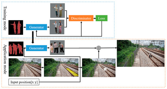 In order to generate high-quality and realistic railway intruding object images, we combine CGAN and DCGAN to construct a conditional DCGAN (C-DCGAN). The framework consists of the training mode and application mode, as shown in Figure 4. In the training mode, the C-DCGAN model is trained on the paired samples so as to learn the map from the semantic images to real images. In the application mode, the trained generator is then extracted to translate the input semantic image to a foreign object image in a higher size. At the same time, the scale of the generated foreign objects in different railway positions is calculated based on the invariance of the gauge constant. The foreign object is synthesized to the railway scene at pixel-level eventually.
