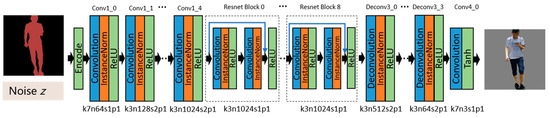 The generator adopts a full convolutional structure, consisting of five convolutional layers as encoders, nine residual modules (Resnet block) [35] as converters, and four deconvolutional layers as decoders. Table 1 shows the architecture of the generator. Firstly, the input semantic image preprocessed by one-hot encoding is input into the convolutional layers for encoding. The image is downsampled by the convolution of a stride of two, instead of pooling for reducing the loss of feature information. The convolutional layers extract the information from the feature maps and compress them into a 32 × 32 × 1024 tensor. ResNet blocks are introduced to convert the image features. Each residual module contains two convolutional layers, after which the feature map is directly added to the input through a shortcut connection so as to reduce the information loss during the conversion process. Meanwhile, the residual module can avoid the problems of degradation and gradient disappearance in such a deep network training. The tensor size is kept unchanged by the residual module layer. Then, the feature maps are upsampled by the deconvolutional layers and are restored to low-level feature maps. Finally, the maps are restored to an actual image. It should be noted that the ReLU activation function is used after each convolution layer, except the last one, to reduce the possibility of gradient disappearance and over-fitting. The last convolution layer uses a Tanh activation function. At the same time, in order to avoid gradient explosion and to speed up the convergence of the model, the instance normalization layer is added after each convolution layer [36]. The generator network is shown in Figure 5, where k means kernel size, n represents feature maps, s means stride, d means dilation, and p is padding.