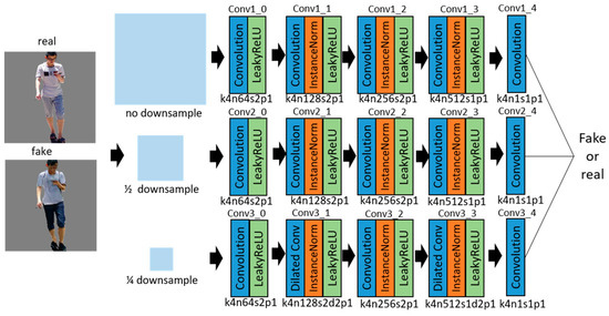 The task of the discriminator is to discriminate between the real and generated samples at a higher size, under the consideration of the image global and local features. A deeper network or a larger convolution kernel can provide a larger receptive field for global features extracting, but there is the disadvantage of over-fitting. In this paper, the multi-scale discriminators network is used, which contains three discriminators models. They extract the features at original, 1/2, and 1/4 of the downsampled scales, as shown in Figure 6. The architecture of the multi-scale discriminators network is shown in Table 2. Each discriminator includes convolution, instance normalization, and LeakyReLU activation functions. The coarse-scale discriminator uses dilated convolution [37] instead of ordinary convolution to reduce the information loss and make the receptive field exponentially grow [38]. The fine scale discriminator focuses on the local detail information and guides the generator to produce finer images. The multi-scale discriminator network captures the image information to the greatest extent for higher-size image discrimination.