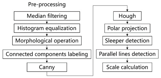 Overview of the generated object size estimation algorithm. The rail line features are highlighted with the pre-processing, including median filtering, histogram equalization, morphological operation, and connected components labeling. Then, the edges are extracted by the Canny. The rail lines are detected by Hough based on polar projection. Parallel sleepers are also detected for the scale size calculation.