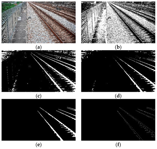 Railway scene image pre-processing: (a) original railway scene; (b) median filtered and binarization; (c) dilation; (d) erosion; (e) eight-connected components labeling; (f) Canny.