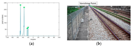 After pre-processing, the rail features are outstanding, but it is still difficult to directly detect all of the rail lines. According to the perspective projective imaging model, parallel lines in the real world are mapped into lines intersecting at a point in the image plane, which is called the vanishing point. In a straight railway scene, all of the rails and sleepers are parallel to each other, respectively. The vanishing point model of the rails and sleepers is shown in Figure 10. The rails are intersected at point O1, and the sleepers are intersected at point O2. The Hough transform is a commonly used method for line detecting [41,42,43]. Here, we also used it to detect the two most significant straight rail lines and to determine their vanishing point O1. As all of the parallel rails pass through the vanishing point O1, the polar coordinate system can be established centered on the vanishing point. The polar projection method counts the white pixel numbers of the lines passing through the vanishing point in any direction. The peaks of the polar projection stand for the most obvious rails, as shown in Figure 11a. The parallel rails are detected in Figure 11b.