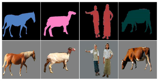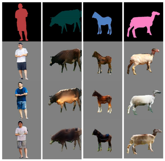 Our dataset includes 11,615 semantic and real-image pairs of pedestrians, sheep, cows, and horses, as shown in Figure 13. The contents of the dataset are shown in Table 3. For the training set, we used 80% of random samples of each category. The remaining 20% of the samples we allocated to be the validation sets.