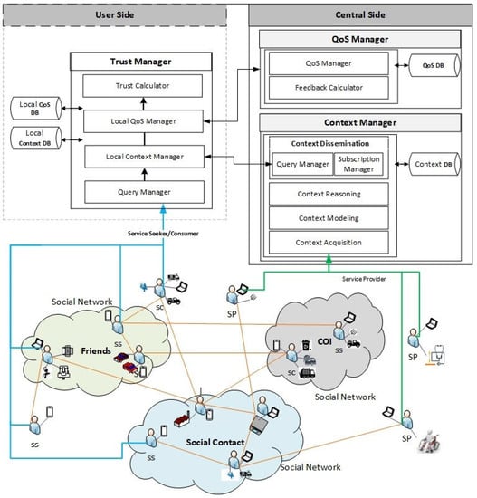 For assisting service seekers, in identifying and selecting context-aware trustworthy services fulfilling the QoS criteria, trust is managed at the centralized and at the user level as well. Besides this, social relations are also considered for evaluating and managing the trust. The QoS manager identifies the services based on criteria defined by an SS. It also maintains the feedback given by a SC. The Context Manager first registers the context of services that are being provided by SP, models it, makes reasoning and then disseminates it, and hence completes the life-cycle of context as described in []. The details of the major components of the system are described in the following subsections.