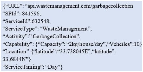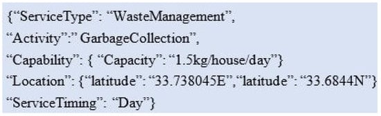 The matching and identification of the services based on the context of the SS is described in Algorithm 1. The SS gives the parameters of which is a service category, depicting service name, manifests capability which may have many variables. As shown in Figure 3, the capability of the smart bin is 2 kg garbage per house per day. The energy/battery level of the sensors embedded in this smart bin might be another capability. Then, the location of a service is identified in the form of longitude and latitude . The importance of the distance between the location of SP and the location at which a service is required cannot be ignored. Therefore, the Haversine formula for distance calculation is considered in the CATSWoTS. The mentioned formula calculates the distance by taking the values in longitude and latitude and measures the distance in kilometers or miles. The “when” of the context can be covered in different aspects like the aging of the device and the time at which a service is required. In this example, the service timing is significant as the waste management company provides service in the morning, afternoon and in the evening.