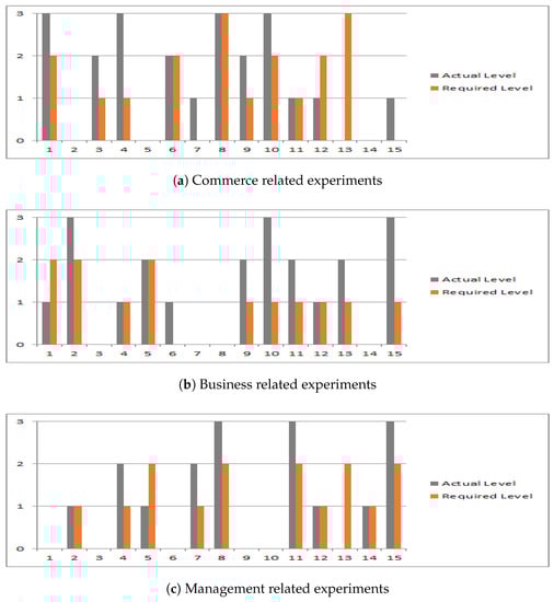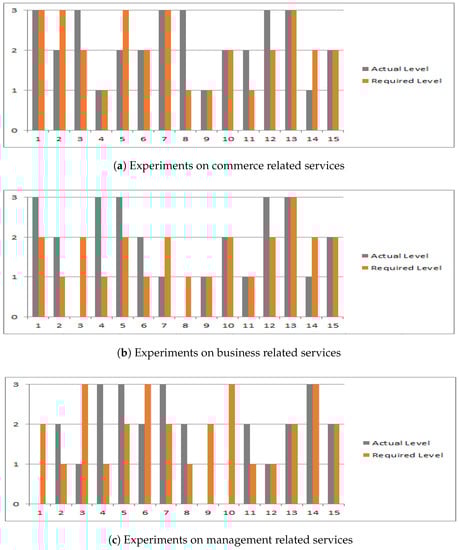 The x-axis shows the number of requests generated. The y-axis shows the QoS level of a service where “required” level manifests the level desired by a service seeker and maximum “received” level, a service provided from among the identified services in each request. The real dataset used in the evaluation acts as a ground truth. For testing purposes, we have considered three attributes (reliability, availability, and latency). A service seeking node entered the weight of each criterion based on the requirements. For example, the SS wanted the services of a commerce company always available for them. Therefore, the SS gave more weight to availability than reliability. The shortlisted services are then evaluated based on Equation (5) and trust level is calculated for each service based on Equation (6). The CATSWoTS gave the sorted list of service providers that were close to the proximity of the SS. The same process of evaluating all the shortlisted service providers for different values of the QoS attributes was completed in this phase. It was observed that not all the shortlisted services fulfilled the criteria required by the SS. Figure 7a shows the final results for the commerce category. It is significant to note that level 1 shows that the identified service fulfills only one QoS criterion required by the SS, level 2 manifests that the identified service fulfills two QoS criteria, whereas level 3 symbolizes that the identified service fulfills all three criteria of QoS. It is evident that seven queries recommended one service at least, which was above the criteria. Four queries presented at least one service that fulfilled the exact criteria, whereas four queries were not able to identify any required service. Similarly, Figure 6b,c show the queries’ results for the business and management categories, respectively.
