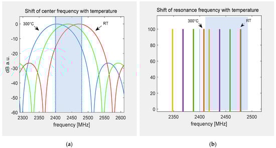 Sketch of the frequency shift due to an operation temperature of 300 °C with respect to the ISM-band for delay lines and resonators: (a) While only a part of the transfer function stays within the band at RT and 300 °C (red, blue), the devices can still be interrogated. The optimal operation point is set to 150 °C (green). (b) Using resonators, only one (red) stays in the band. The other devices marked as green, violet, and yellow get shifted out of the band when the temperature shift of ~280 °C is applied.