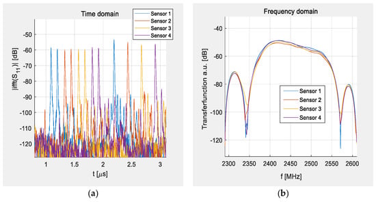 Measured S-parameters of four individual sensors: (a) left: time domain, the different sensor responses are shown in different colors; (b) right: frequency domain, all sensors show the same transfer function—a wideband plateau so that the interrogation in the ISM band can happen successfully no matter of the temperature shift.
