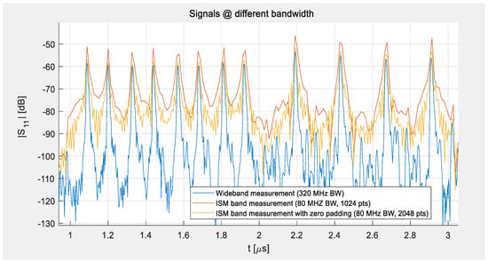- Inverse Fourier transform (IFFT) of the windowed S-parameters to the time domain, with applied zero padding to get 2048 data points for the 80 MHz bandwidth (2.4–2.48 GHz) and 8192 points for the 320 MHz bandwidth (2.29–2.61 GHz), respectively.