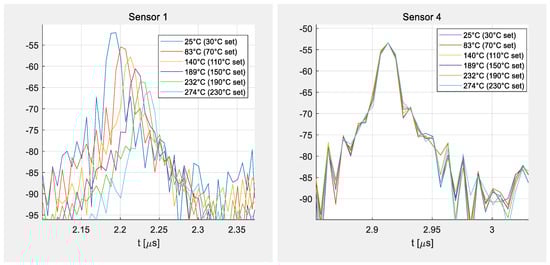Figure 5 and Figure 6 show selected data taken at different temperatures with a bandwidth of 80 MHz and zero padding of 2048 points. The figures demonstrate the shift of the delay time with the temperature. Sensor 1 was placed in the middle of the furnace, close to two reference sensors (K-type thermocouples), showing considerable time shifts for each temperature level (Figure 6a), whereas sensor 4 was kept outside of the heated area behind the heat shield and was hence hardly influenced by the heating so almost no time shift is visible (Figure 6b). Sensors 2 and 3 were placed in between sensors 1 and 4, showing the decreasing heat levels at their individual positions in less distinct time shifts. The temperatures given in the legend of the figures correspond to the temperatures set in the controller of the furnace (marked as set) and the data from the reference sensors and apply only for sensor 1. The other sensors show smaller time shifts as they were heated less.