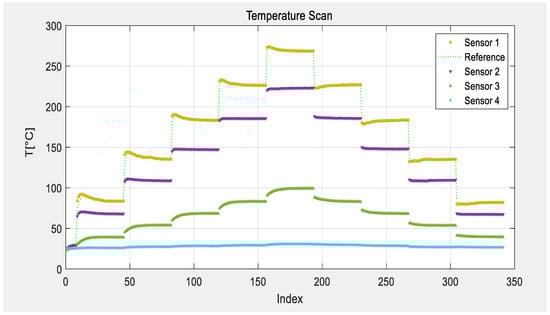 Temperature scans with four SAW sensors at different temperatures inside a furnace.
