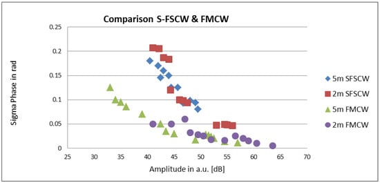 The phase resolution was measured for the two reader systems as a function of the signal amplitude. This data is shown in Figure 9. The given amplitude values are only for comparison and do not give absolute values as they comprise the amplifiers and ADCs in the reader system. The different signal strengths were induced by various reading distances and cable lengths. The experiments demonstrate clearly that the achievable resolution depends strongly on the signal amplitude. Because of the different reader architectures and the resulting readout strategies of the two reader types, the main difference between the system performances is mainly because a readout sweep of an S-FSCW unit takes more time than a sweep using a FMCW unit. To still be comparable, an equal sampling rate of 5 Hz was set up for both systems, resulting in no averaging for the S-FSCW reader in these experiments, whereas an averaging of 100 was applied for the FWCW. If a slower sampling rate is acceptable, the resolution of the system can be increased by applying higher averaging (see footnote in Table 2).