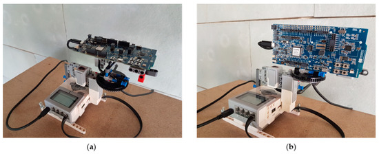 The OD allows a receiver (nRF52840 DK in this case) to be aligned automatically with a certain angle on the XY plane (or ground plane) with a resolution of 1°. The receiver can be attached horizontally or vertically to the OD (see Figure 1a,b). For the construction of the OD, parts of the Lego MindStorms EV3 Education kit were used [58,65]. The main parts were: