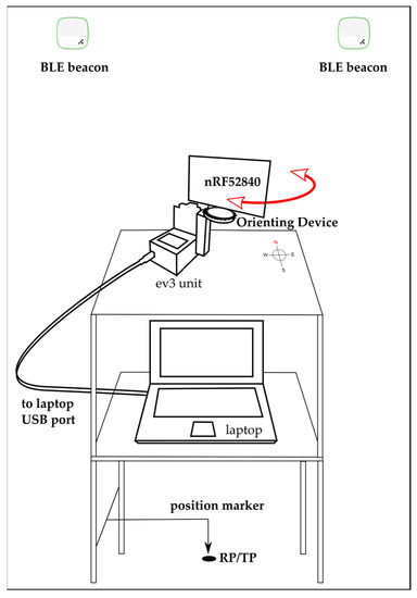 An ASUS VivoBook X540U laptop with a Nordic Semiconductor nRF52840 BLE Development Kit (nRF52840 DK), based on SoC nRF52840, was used to collect the BLE signals. The nRF52840 DK was fixed on an orienting device (OD; see Figure 1a,b) and connected to the laptop port via a USB cable [58].