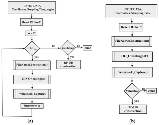 The sniffing software employed was Nordic Semiconductor nRF52Sniffer v2.0.0-beta3 together with Wireshark 2.6.1. The data collection process was initiated through a batch file that controls the orienting device and calls the sniffing software. Figure 3a,b show the algorithm for the data collection process, depending on the database to be generated. In the case of the RP-DB, the coordinates of the particular RP, the sampling time and the angles at which the OD will place the receiver are entered as input data. In the case of the TP-DB, the coordinates of the particular RP and the sampling time are entered as input data. The OD is reset to 0° and a process begins in which the receiver is oriented by the different prefixed angles, taking the different data (mainly RSS, protocol, channel and MAC address) of each beacon through Wireshark. The data are validated at the end of the process, and if there are no capture errors, these values as well as the angles are inserted in the RP-DB. In the case of TP-DB, the process is similar but, in this case, the receiver is only situated in a specific orientation: In the tests carried out it was 90° or the north direction.