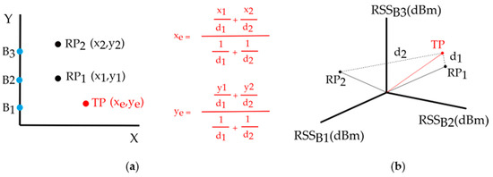 Example of application of the weighted k-nearest neighbor (WKNN) algorithm for two reference points, RP1 and RP2, one test point, TP, and three beacons, B1, B2 and B3: (a) Calculation of the estimated coordinates as a weighted average of the coordinates of k-nearest RPs (k = 2) with the shortest distance to the TP in the signal space; (b) Euclidean distances of the RPs to the TP in the signal space.