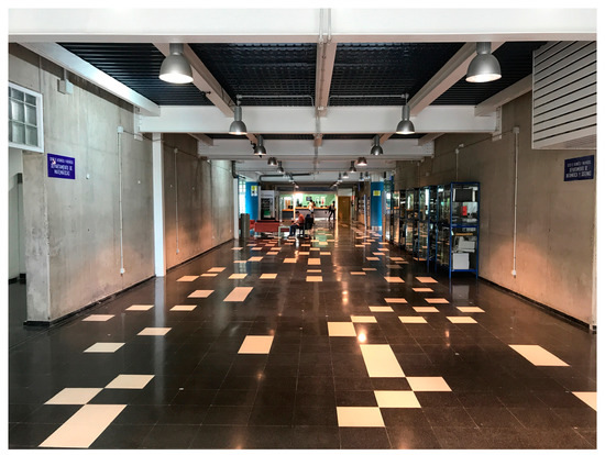 The second chosen scenario was a corridor near the access to the library in the School of Computer Engineering of the University of Las Palmas de Gran Canaria. In that scenario, a rectangular testbed (hereinafter TB2) of 16 m × 7 m with an area of 112 m2 was chosen with a grid of 16 RPs in a single line and 14 TPs (see Figure 8), taking the (x, y) coordinates of all points with a laser pointer. The materials of which TB2 and its furniture are composed of mainly ceramic floors, concrete walls, metal and glass showcases and metal ceilings. Fourteen beacons were installed giving a density of one beacon per 8.0 m2. The first seven, labeled with odd numbers (B1 to B13 of Figure 8b), were placed on a wall with a distance of 2.15 m between each of them, while the remaining seven, labeled with even numbers (B2 to B14), were placed on the opposite side, some on top of the showcases (B2 to B12) and some on top of a wall (B13, B14), with the same distance between them and a certain displacement with respect to beacons on the opposite wall: The objective was the same as in TB1. All the beacons were configured with the same values of Tx and A for all tests. In this scenario, the movement of people during the tests through the testbed was continuous in both phases (see Section 5.9, Section 5.10 and Section 5.11).