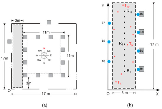 Schematic view of the second scenario: (a) Dimensions and orientations, (b) beacons, RP and TP positions.