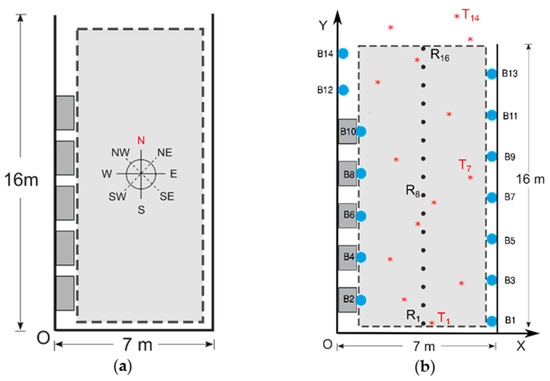 Schematic view of the first scenario: (a) Dimensions and orientations, (b) beacons, RP and TP positions.