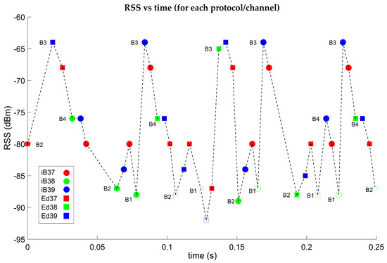 We carried out some studies prior to the tests. In the first, we represented the RSS values vs. time for each protocol, channel and beacon. Figure 9 shows the case corresponding to the test of Section 5.1. In this image, several things were observed: The receiver capturing data packets coming from the beacons follows in general the sequence of channels 37, 38, 39, independently of the protocol and beacon. It was also observed that the packets that Wireshark reports as erroneous (empty circles or squares) corresponded to very low RSS values: These packets were ruled out in all tests.