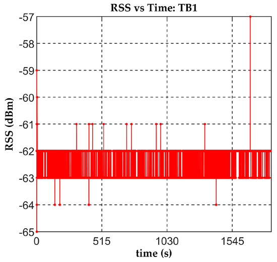 In the third preliminary study, we took the RSS values of seven beacons in testbed TB1 during one hour at an intermediate point on the grid. The objective of this study was to observe the temporal behavior of the BLE signal and its fast fades in order to filter out the outliers if necessary. Figure 10 shows the RSS vs. time plot: As there were no people present during this preliminary test, the signal was almost constant but there were outliers of up to 6 dBm. In some of the subsequent tests, we filtered outliers that were more than three scaled median absolute deviations.