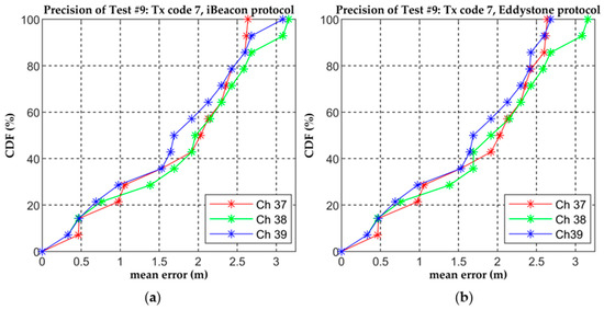 In this work, positioning accuracy and precision were expressed, respectively, by the mean error and the cumulative distribution function (CDF) obtained through the WKNN algorithm [20]. Euclidean was the distance used for the calculation of weights in the WKNN algorithm since in previous works it has been detected that the distance/similarity used is not critical [69]. As was mentioned in Section 3, the current firmware versions installed in the two brands of Bluetooth 5 beacons only support a 1 Mbps bit rate, therefore, this was the default value for all tests. Although the specific value of A = 100 ms consumes more battery in the beacons than other higher values, it has been used in many tests because it considerably reduces site survey time by allowing sufficient samples to be obtained in a short time interval and because increasing the CPh sampling time does not necessarily increase accuracy significantly [49,69]. Nevertheless, in some tests the A = 500 ms value was also employed. In order to reduce the CPh, we also tested lower radio map densities by increasing the distance between RPs: Increasing the radio map density provides better accuracies but only to a certain extent [28].