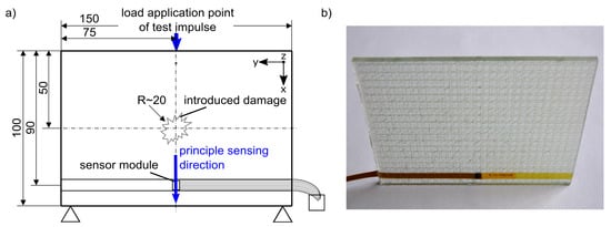 The demonstrator for the reference comparison corresponds to a lab model with a simple geometry. The demonstrator is a thin plate in which one sensor device is integrated (Figure 3). In the experiment, the test excitation is applied by an impulse of a drop weight. For this purpose, the support of the plate is vertically free at two spots along its long edge (Figure 3a). The sensor device inside the demonstrator is placed 10 mm above the supported edge. The sensor module, as part of the sensor device, is located in the middle over the width of the plate. In the middle of the opposite edge is the load application point of the impulse. The sensor device is aligned to have the principal sensing direction of the sensor module with the impulse direction. The later damage of the demonstrator is precisely introduced on the surface of the plate in its center by an impact damage.
